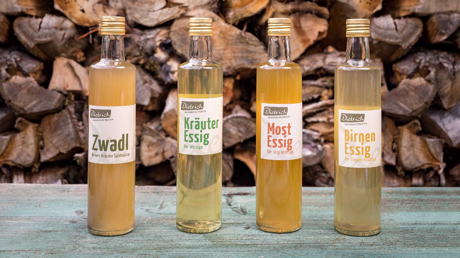 Most, Birnen oder Kräuter: Unser reiner Gärungsessig in drei Geschmacksrichtungen, selbstverständlich aus Direktsaft vergoren, bietet Aroma für jede Gelegenheit.